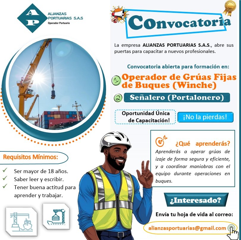 En octubre de 2025, la empresa ALIANZAS PORTUARIAS S.A.S, operador portuario, abrió convocatoria para la formación de nuevos profesionales en el área de operaciones portuarias, específicamente en el curso de Operador de Grúas Fijas de Buques (Winche) y Señalero (Portalonero).